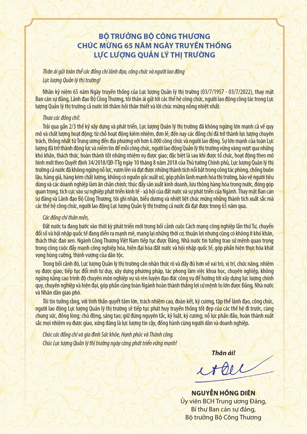 Nhân kỷ niệm 65 năm Ngày truyền thống của lực lượng Quản lý thị trường (03/7/1957 - 03/7/2022), thay mặt Ban cán sự đảng, Lãnh đạo Bộ Công Thương, Bộ trưởng Bộ Công Thương Nguyễn Hồng Diên gửi tới các thế hệ công chức, người lao động công tác trong lực lượng Quản lý thị trường cả nước lời thăm hỏi thân thiết và lời chúc mừng nồng nhiệt nhất.