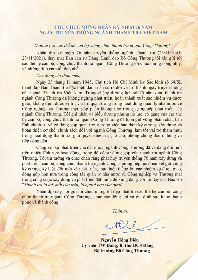 Nhân dịp kỷ niệm 76 năm Ngày truyền thống ngành Thanh tra Việt Nam (23/11/1945 - 23/11/2021), thay mặt Ban cán sự Đảng, Lãnh đạo Bộ Công Thương, Bộ trưởng Nguyễn Hồng Diên đã gửi thư chúc mừng tới các thế hệ cán bộ, công chức thanh tra ngành Công Thương.