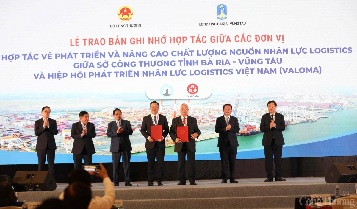 | Thủ tướng Chính phủ Phạm Minh Chính, Bộ trưởng Bộ Công Thương Nguyễn Hồng Diên cùng các đại biểu chứng kiến Lễ trao bản ghi nhớ hợp tác về phát triển và nâng cao chất lượng nguồn nhân lực logistics giữa Sở Công Thương Bà Rịa - Vũng Tàu và Hiệp hội Phát triển nhân lực Logistics Việt Nam. |