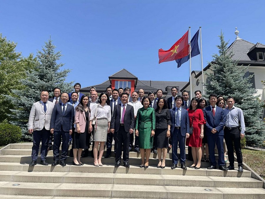 | Bộ trưởng Bộ Công Thương Nguyễn Hồng Diên chụp ảnh lưu niệm cùng các Tham tán Thương mại, Trưởng cơ quan Thương vụ Việt Nam tại châu Âu |