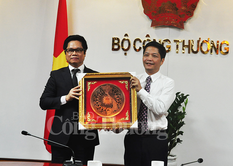 | Đại biểu Vũ Tiến Lộc tặng quà lưu niệm Bộ trưởng Trần Tuấn Anh |