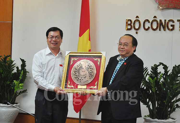 | Đại biểu Nguyễn Hồng Sơn tặng quà lưu niệm cho Nguyên Bộ trưởng Vũ Huy Hoàng |