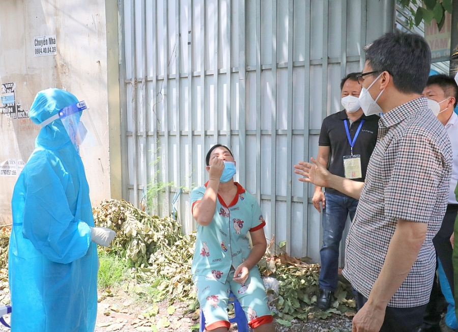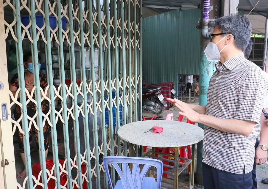 Kết thúc buổi làm việc với lãnh đạo Bình Dương và các đơn vị liên quan, Phó Thủ tướng Chính phủ Vũ Đức Đam đã đến thăm và kiểm tra tình hình phòng chống dịch bệnh Covid-19 tại các phường "khóa chặt" ở TP.Thuận An.