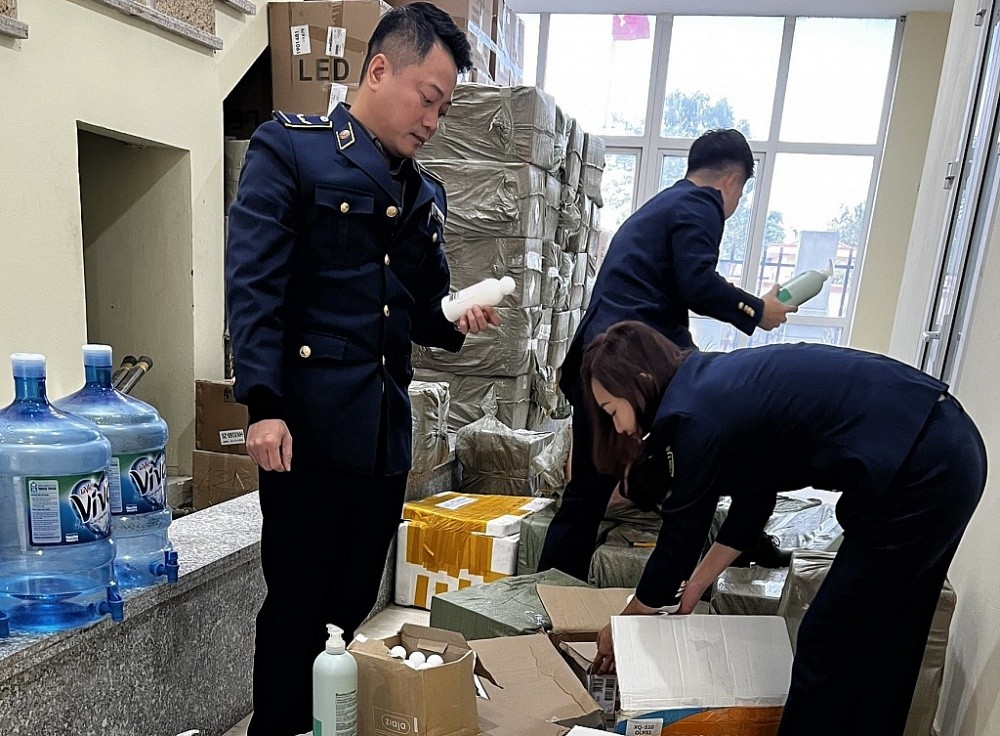 | Lực lượng Quản lý thị trường kiểm tra lô mỹ phẩm vi phạm. |