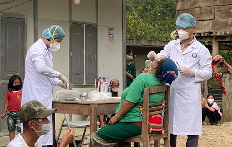 | Cán bộ y tế ở huyện Kỳ Sơn lấy mẫu đối với những người liên quan đến ca bệnh bạch hầu ở Nghệ An. (Ảnh: Hùng Lê) |