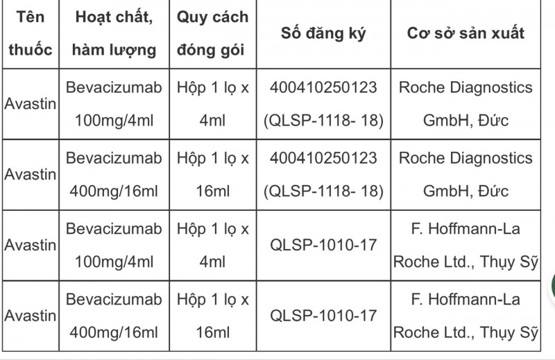 Cục Quản lý Dược (Bộ Y tế) thông tin, đến hết ngày 27/9/2023, chưa nhận được bất kỳ báo cáo phản ánh tác dụng không mong muốn của thuốc Avastin được sản xuất bởi hãng dược Roche liên quan đến việc bệnh nhân bị mất thị lực tại Pakistan. Tại Việt Nam, thuốc Avastin đã được 4 giấy đăng ký lưu hành còn hiệu lực, cụ thể gồm: