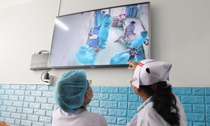 | Nhân viên y tế Bệnh viện Bệnh nhiệt đới (TP. Hồ Chí Minh) giám sát ca bệnh đậu mùa khỉ đầu tiên từng điều trị tại bệnh viện. Ảnh: Xuân Mai |