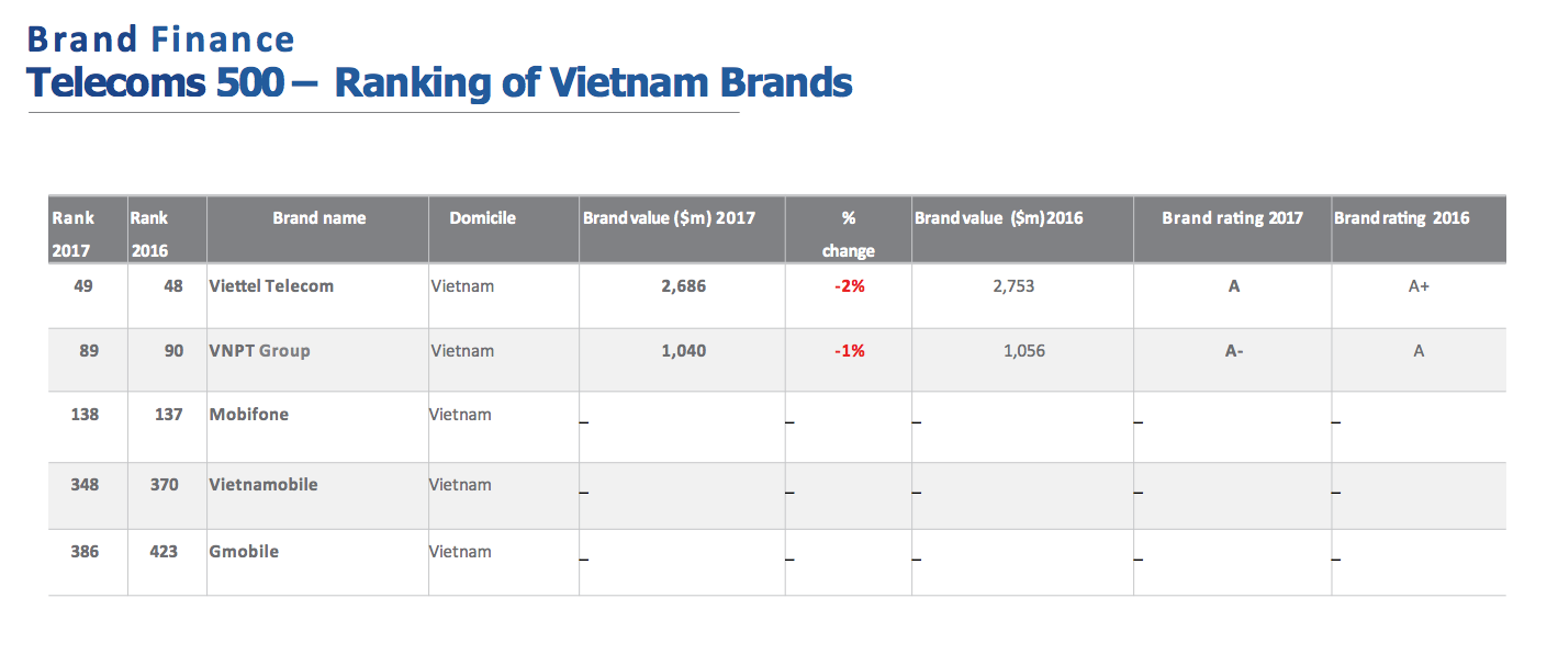 Trong bảng xếp hạng Telecom 500 năm nay có sự góp mặt của 5 thương hiệu từ Việt Nam là Viettel Telecom, VNPT Group, MobiFone, Vietnamobile, Gmobile với thứ tự xếp hạng lần lượt là 49, 89, 138, 348 và 386. Như vậy, theo đánh giá của Brand Finance, MobiFone xếp vị trí thứ hai về giá trị thương hiệu trong ngành viễn thông Việt Nam.