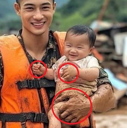 Tuy nhiên, những bức ảnh AI đều có một số đặc điểm dễ nhận biết, và trong đó rõ ràng nhất chính là độ “hoàn hảo” của bức ảnh. Nếu tinh ý, người xem có thể nhận thấy khuôn mặt của cả người "chiến sĩ" và em bé đều hoàn hảo một cách kỳ lạ, không hề có khuyết điểm trên da, thậm chí không có vết bẩn dù ngụp lặn giữa nước lũ, bùn sâu.