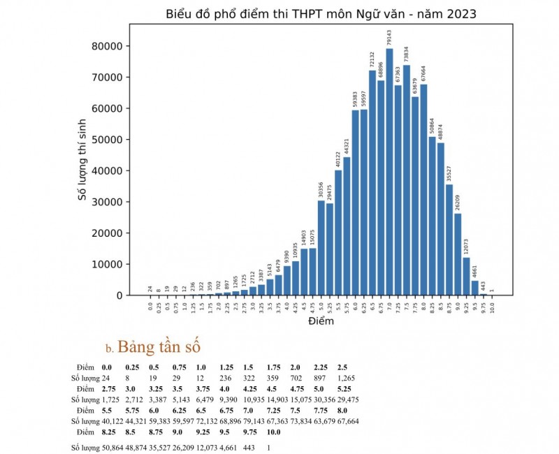 Trong đó, điểm trung bình là 6,86 điểm, điểm trung vị là 7,0 điểm. Mức điểm số có nhiều thí sinh đạt nhất là 7,0 điểm, bằng với năm ngoái.