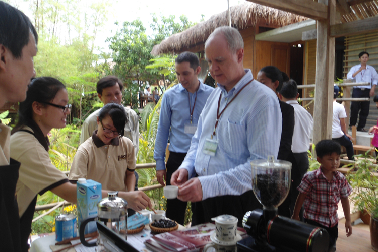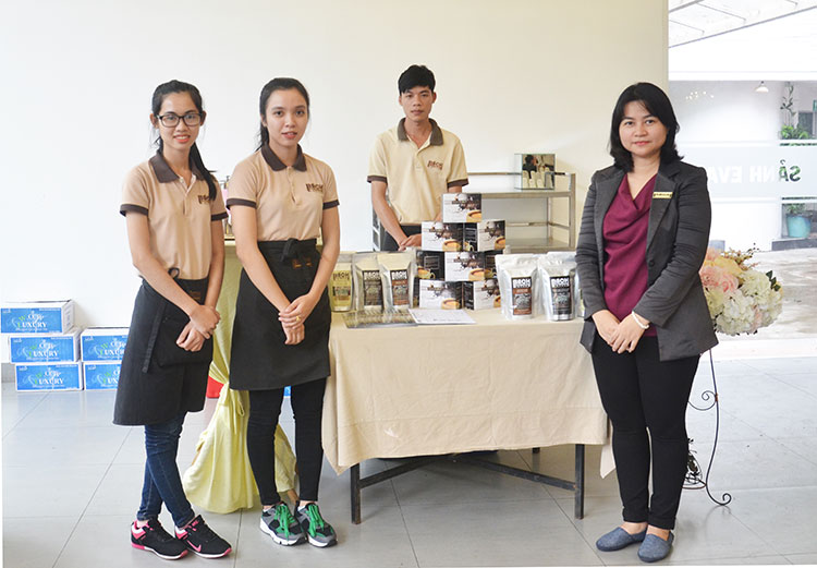 | Tôn Nữ Diệu Thảo (ngoài cùng bên trái) trong buổi giới thiệu sản phẩm cà phê Bách với người tiêu dùng ở TP.Hồ Chí Minh |