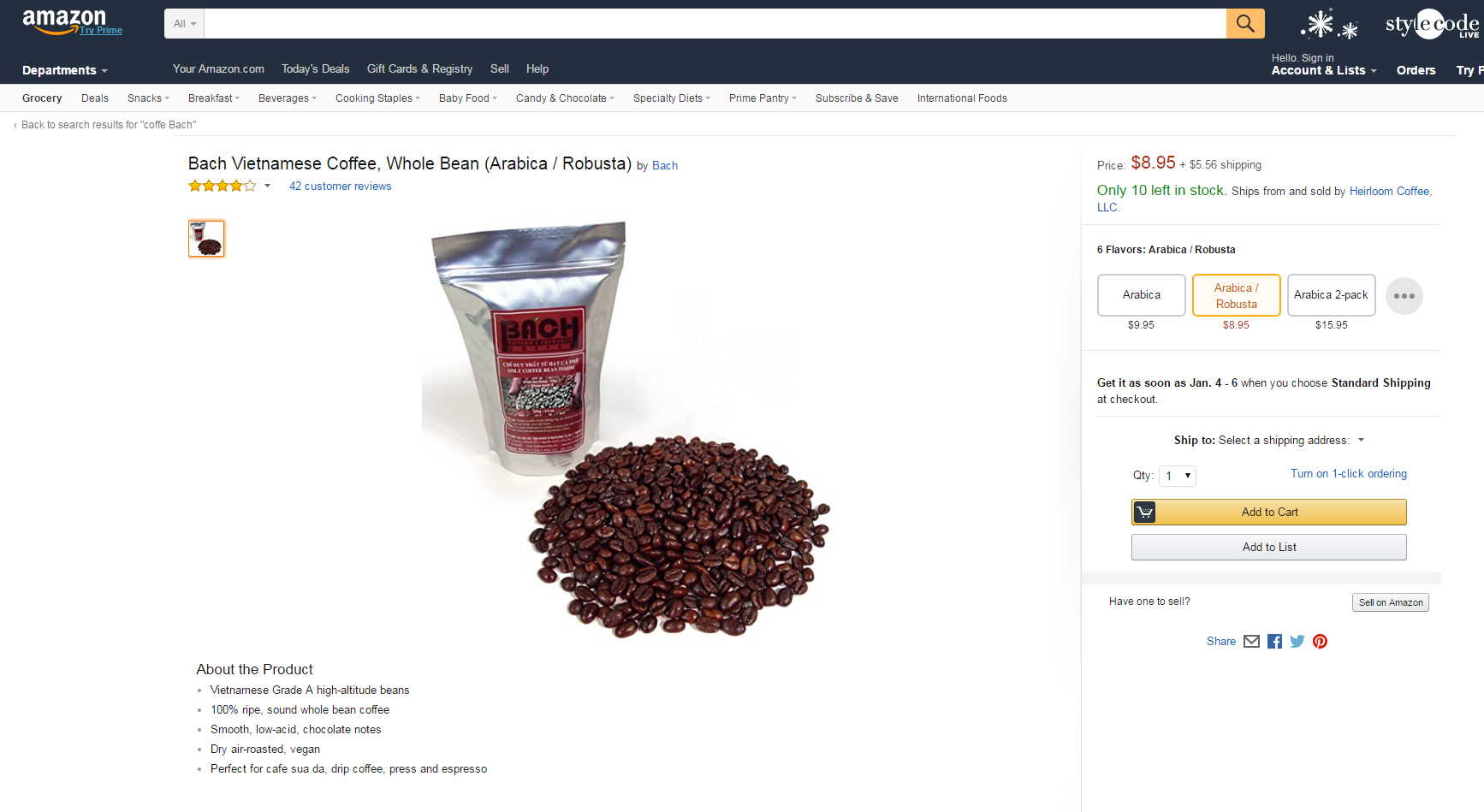 Amazon.com là công ty thương mại điện tử đa quốc gia, đây là kênh bán hàng trực tuyến lớn nhất Hoa Kỳ và đứng vào top đầu của thế giới. Amazon hiện đã lập trang web riêng biệt tại Canada, Anh, Đức, Pháp, Nhật Bản, Trung Quốc và kinh doanh hơn 800 triệu sản phẩm. Về mặt hàng cà phê, Việt Nam chỉ có hai thương hiệu là Trung Nguyên và Bách bán trên hệ thống này. Theo chị Thảo, thực phẩm bán trên Amazon được người tiêu dùng đánh giá theo tiêu chí sao, cao nhất là 5 sao, riêng cà phê Bách hiện đã được khách hàng gần xa đón nhận và đánh giá từ 4-5 sao.
