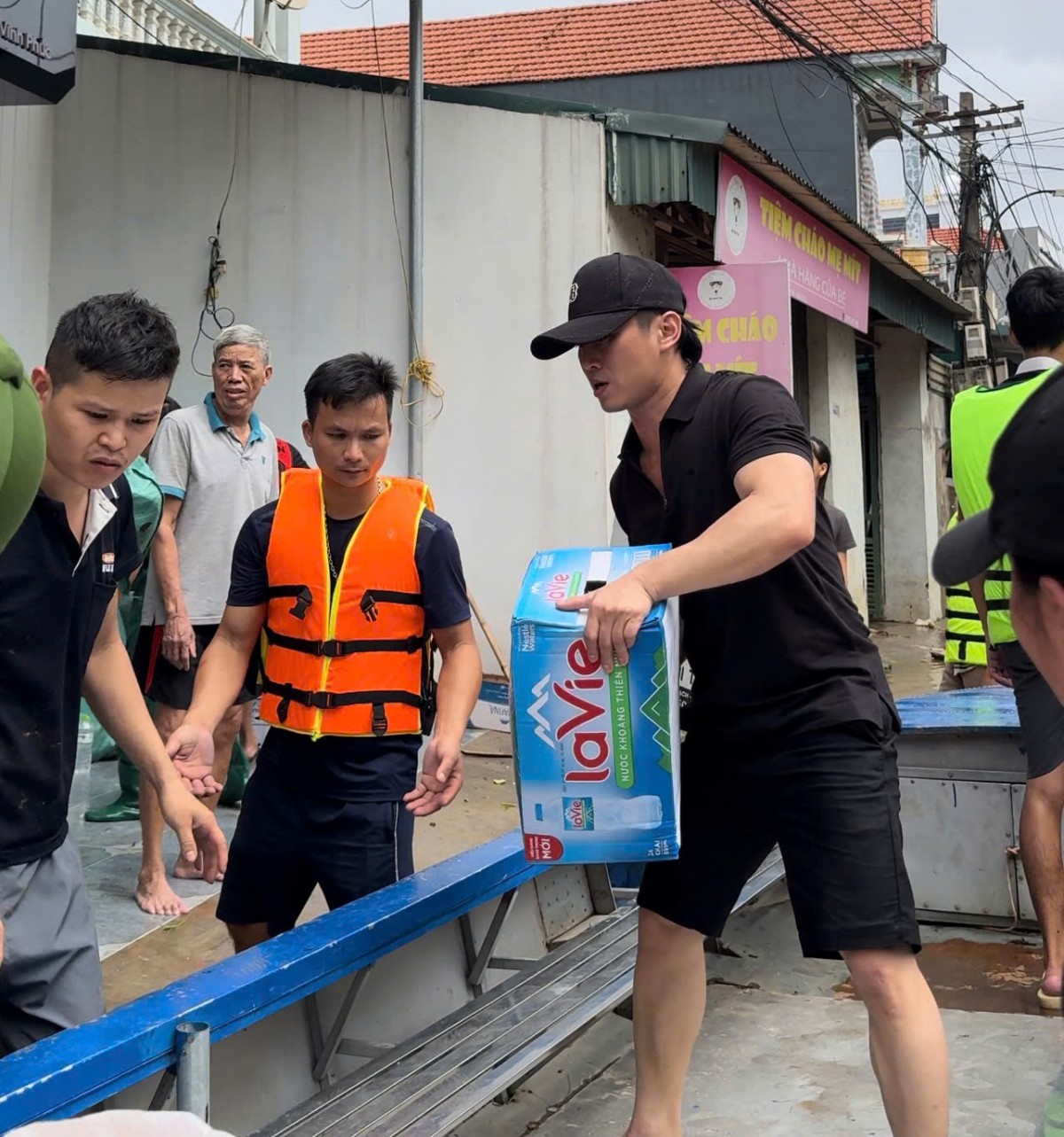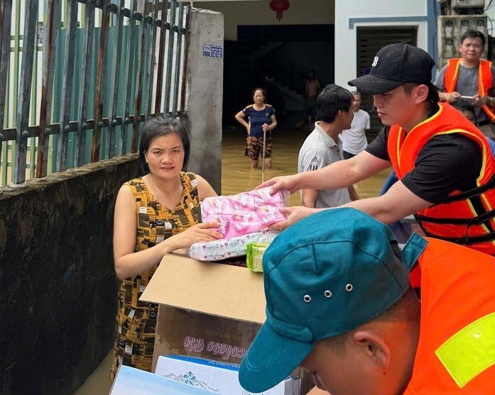 | Ca sĩ Du Thiên trao tận tay hàng cứu trợ cho bà con vùng lũ nặng nhất của huyện Sông Lô, tỉnh Vĩnh Phúc. |