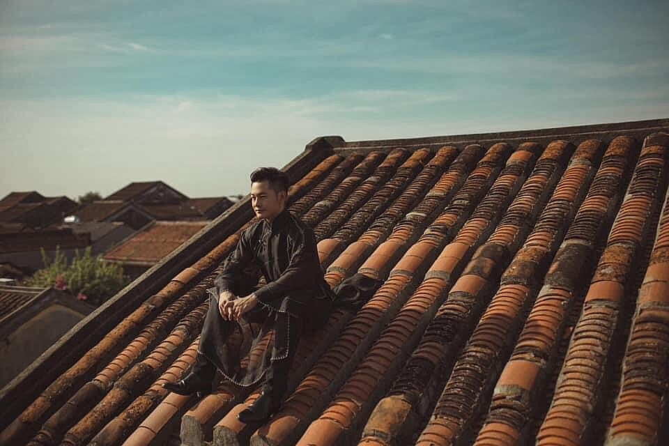 | Hỉnh ảnh nam ca sĩ tạo dáng trên mái nhà cổ ở Hội An. Ảnh chụp từ màn hình |