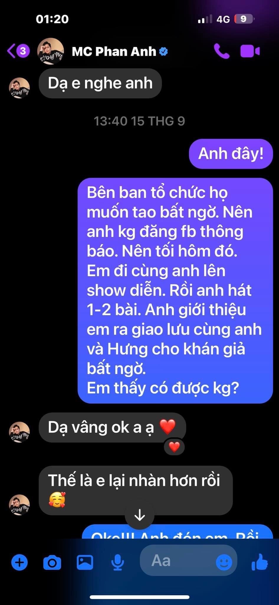Đồng thời, ca sĩ Duy Mạnh cũng chia sẻ những tin nhắn bàn về kịch bản chương trình với MC Phan Anh. Trong đoạn tin nhắn với MC Phan Anh, ca sĩ Duy Mạnh cho biết: “Bên ban tổ chức họ muốn tạo bất ngờ. Nên anh không đăng Facebook thông báo. Nên tối hôm đó. Em đi cùng anh lên show diễn. Rồi anh hát 1-2 bài. Anh giới thiệu em ra giao lưu cùng anh và Hưng cho khán giả bất ngờ”.
