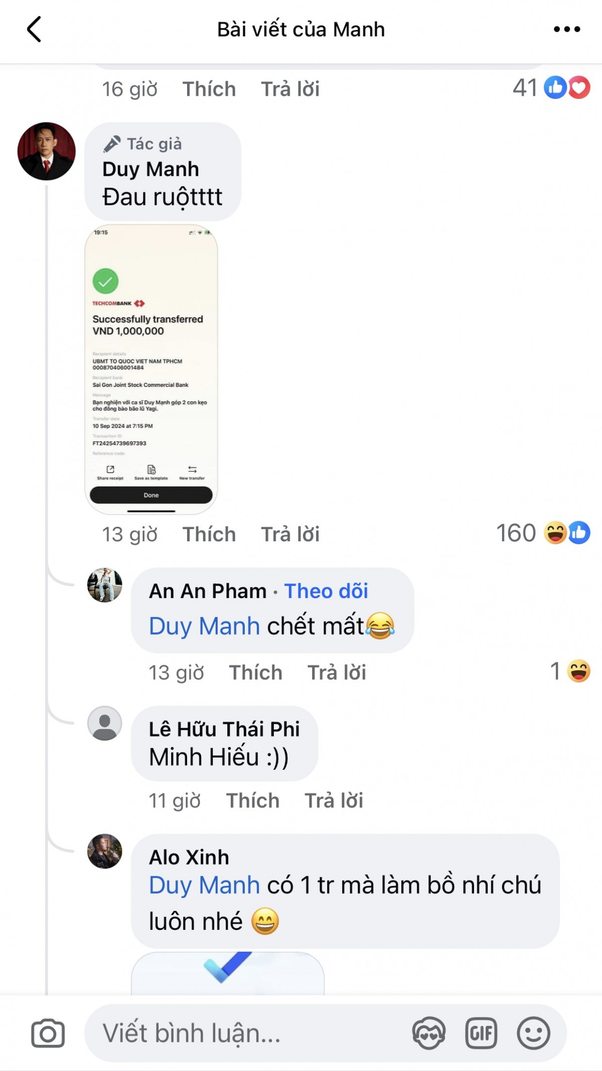 Bên cạnh đó, ở phần bình luận bài viết, ca sĩ Duy Mạnh tiếp tục có thái độ chia sẻ lại các đơn chuyển khoản và nói “đau ruột”. Điều này được nhiều người đánh giá là thiếu nghiêm túc, chuẩn mực, tha hóa trong lối sống.