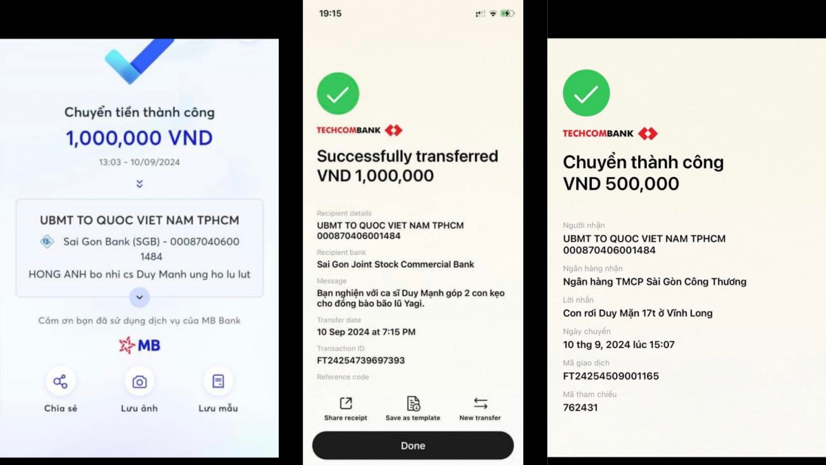 Trong đó, ca sĩ Duy Mạnh có thông tin rằng: “Cám ơn tất cả những người bạn, những người anh em đã gửi hỗ trợ bà con nơi bão lũ thông qua UBMT Tổ Quốc. Stk: 000870406001484. SAIGONBANK. Anh em bạn bè ghi nội dung ‘Bạn Duy Mặn’ hoặc ‘Anh của Duy Mặn’ cho tớ được hưởng tiếng thơm tí!!!”.