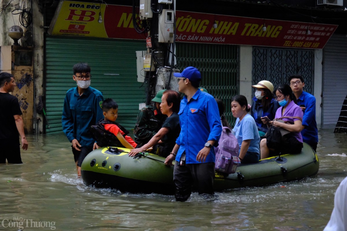 | Lực lượng thanh niên phải lội nước, dùng thuyền hơi để đưa người già, trẻ em tại phố Phúc Tân. Ảnh: Trần Đình |