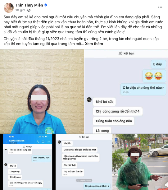 Trước đó, chiều 19/3, Trần Thụy Miên đã đăng tải bài viết dài trên trang cá nhân, trong đó cho biết, thời điểm tháng 11/2023 gia đình tuyển giúp việc để trông hai con nhỏ. Trong lúc chờ người quen sắp xếp thì cô liên hệ qua trung tâm và được giới thiệu một nữ giúp việc.