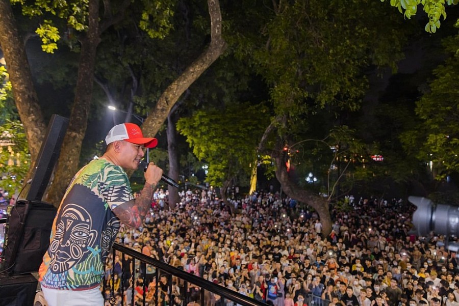 | Ca sĩ Tuấn Hưng biểu diễn tại ban công trên rên phố Hàng Khay, quận Hoàn Kiếm, Hà Nội |