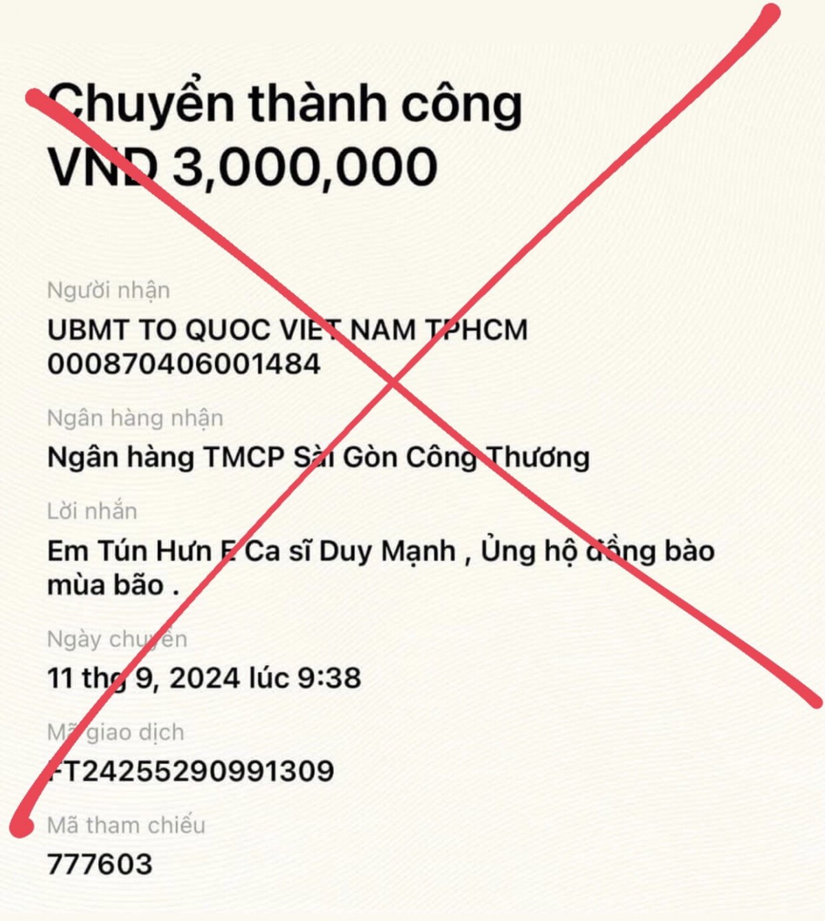 | Ca sĩ Tuấn Hưng khẳng định đơn chuyển khoản kể trên không phải của anh. Ảnh: Chụp màn hình |