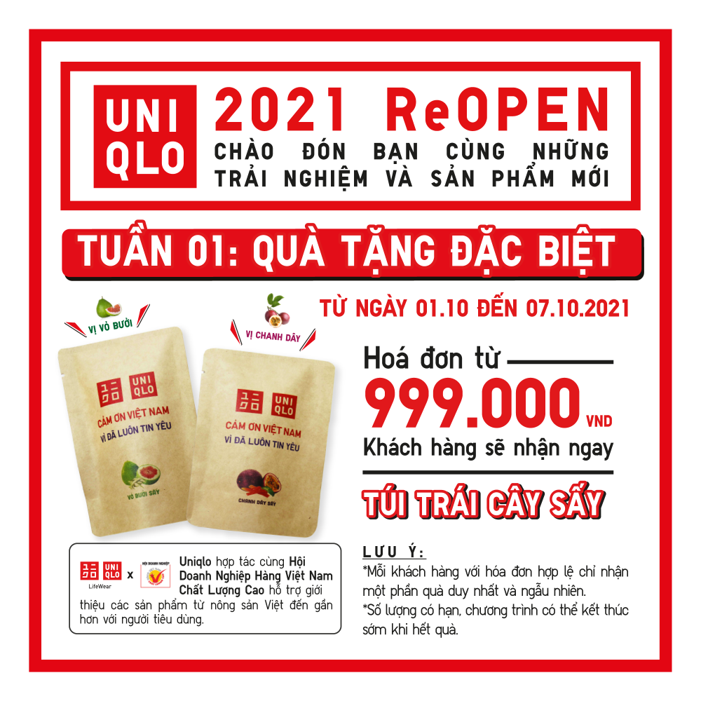 Cụ thể, các sản phẩm trái cây sấy khô do nông dân và doanh nghiệp Việt Nam sản xuất đạt chuẩn sẽ là món quà đặc biệt gửi tăng khách hàng với mỗi hoá đơn mua hàng trị giá trên 999.000 đồng, áp dụng cho tất cả các cửa hàng UNIQLO tại Hà Nội từ ngày 01/10 đến ngày 07/10/2021. Bên cạnh đó, thông qua hoạt động trưng bày, giới thiệu sản phẩm, các sản phẩm chất lượng cao, đạt chuẩn từ các doanh nghiệp, nông dân địa phương sẽ được mang đến gần hơn với khách hàng.