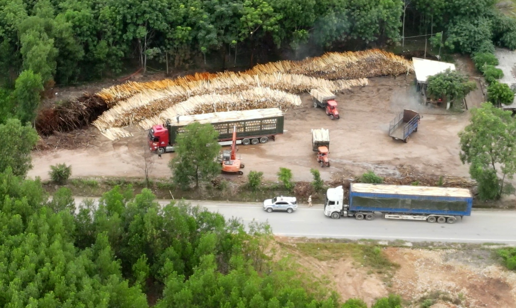 Ngay sát quốc lộ 15, một điểm thu mua gỗ rừng trồng trái phép (thuộc địa bàn xã Kim Thủy, huyện Lệ Thủy, tỉnh Quảng Bình) không hề bảng hiệu đang hoạt động tấp nập phía bên trong. Chiếc máy gắp hoạt động liên tục đưa gỗ lên xe container. Ước có hàng nghìn khối gỗ đang được tập kết bên trong. Trong khi đó, bên ngoài quốc lộ 15, các xe chở gỗ tràm được lực lượng cảnh sát giao thông kiểm tra sơ bộ rồi nhanh chóng rời đi.