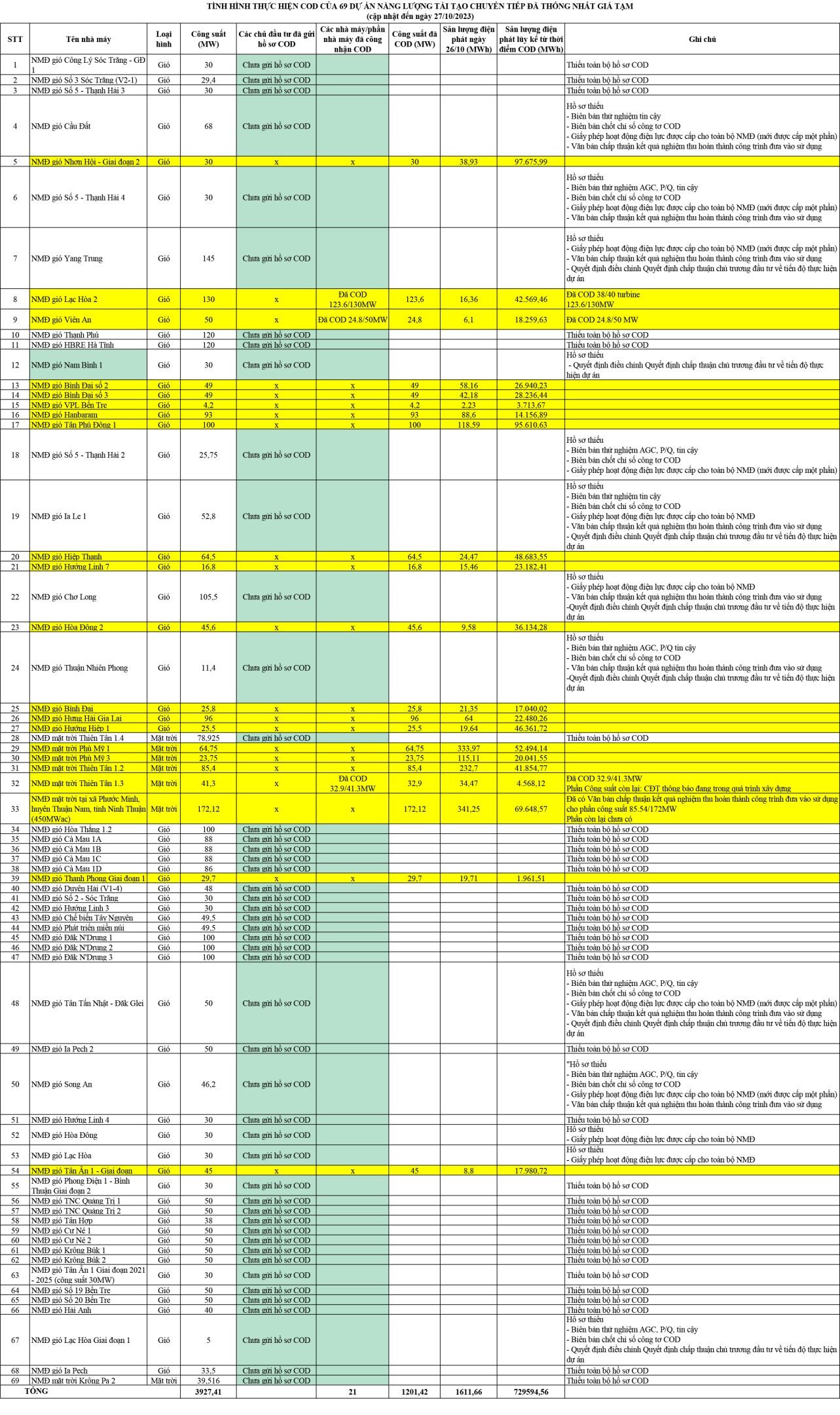 | Lũy kế đến ngày 27/10/2023, 21 dự án năng lượng tái tạo chuyển tiếp đã hoàn thành thủ tục COD tính từ thời điểm COD gần 730 triệu kWh. |