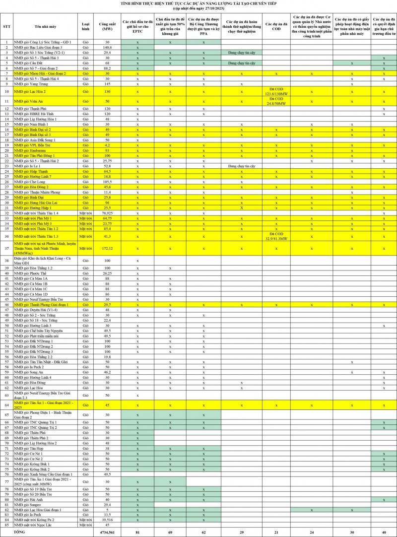 EVN công bố cập nhật chi tiết về tình hình thực hiện thủ tục của 85 dự án năng lượng tái tạo chuyển tiếp và thông tin về việc chuẩn bị thủ tục COD của 69 dự án đã đề xuất giá tạm dưới đây:
