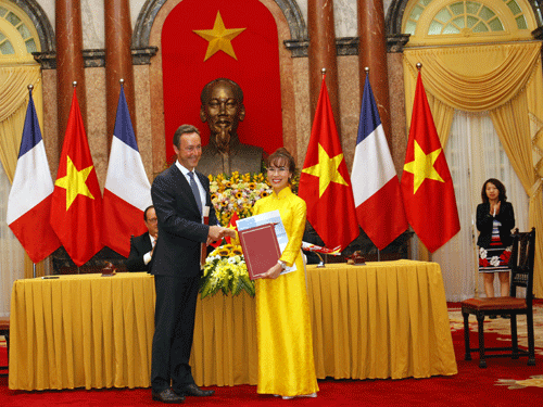 | Đại diện Vietnam Airlines và Airbus ký Biên bản ghi nhớ trước sự chứng kiến của Chủ tịch nước Trần Đại Quang và Tổng thống Pháp Francois Hollande |