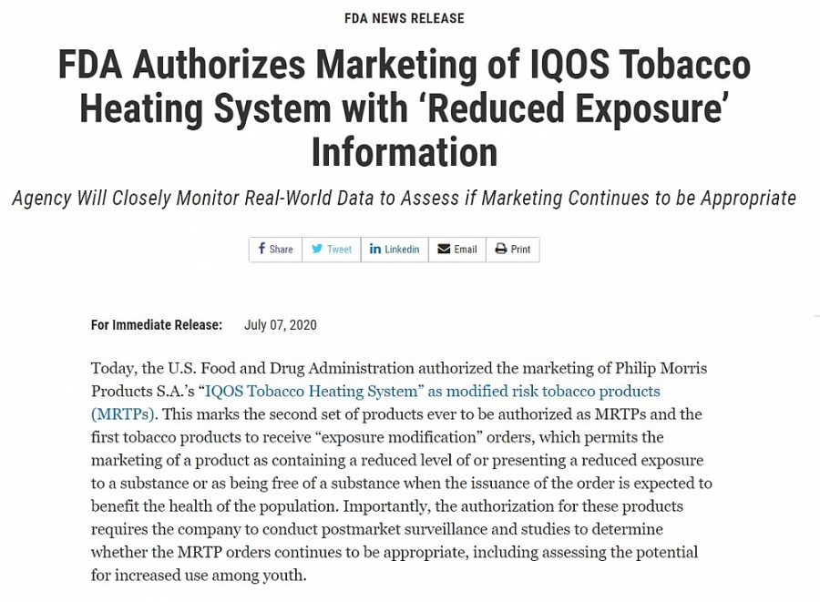 Đến tháng 10/2019, FDA mới tiếp tục cho phép 8 dòng sản phẩm thuốc lá ngậm snus được phép công bố thông tin Giảm thiểu rủi ro sau khi đã được phép kinh doanh tại Hoa Kỳ 4 năm trước đó. Trong khi đó, tháng 7/2020 (chỉ trong vòng 8 tháng kể từ ngày được phép thương mại hóa), sản phẩm thuốc lá làm nóng của PMI lại tiếp tục được phép công bố thông tin là sản phẩm “Giảm thiểu phơi nhiễm” với các chất có hại hoặc có tiềm năng gây hại lên cơ thể người dùng so với thuốc lá điếu đốt cháy.