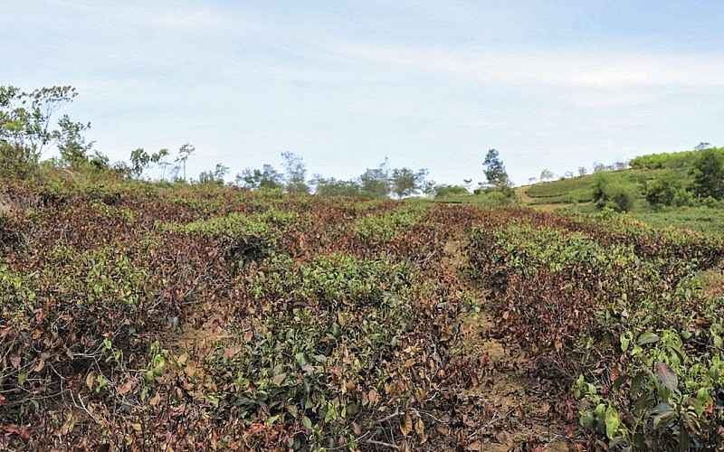 | Nắng nóng khiến nhiều ha chè ở xã Hương Trà đã khô héo, cháy sém, lá rụng đầy gốc. |