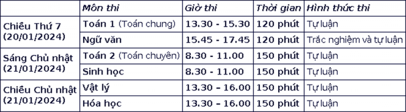 Trừ đề Ngữ văn kết hợp trắc nghiệm và tự luận, các môn còn lại thí sinh thi tự luận. Các môn thi chung diễn ra trong 120 phút, môn chuyên 150 phút. Cấu trúc đề và thời gian thi tương tự kỳ thi chính thức của trường. Trường mở đăng ký từ nay tới hết ngày 9/1, lệ phí là 150.000 đồng/môn. Thí sinh sẽ nhận kết quả bài thi sau 7 ngày. Đợt thi thứ hai dự kiến diễn ra vào ngày 9 và 10/3/2024. Trường chưa thông báo thời gian đăng ký thi cho đợt này.