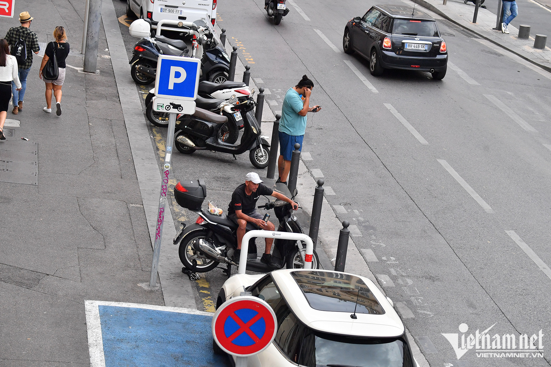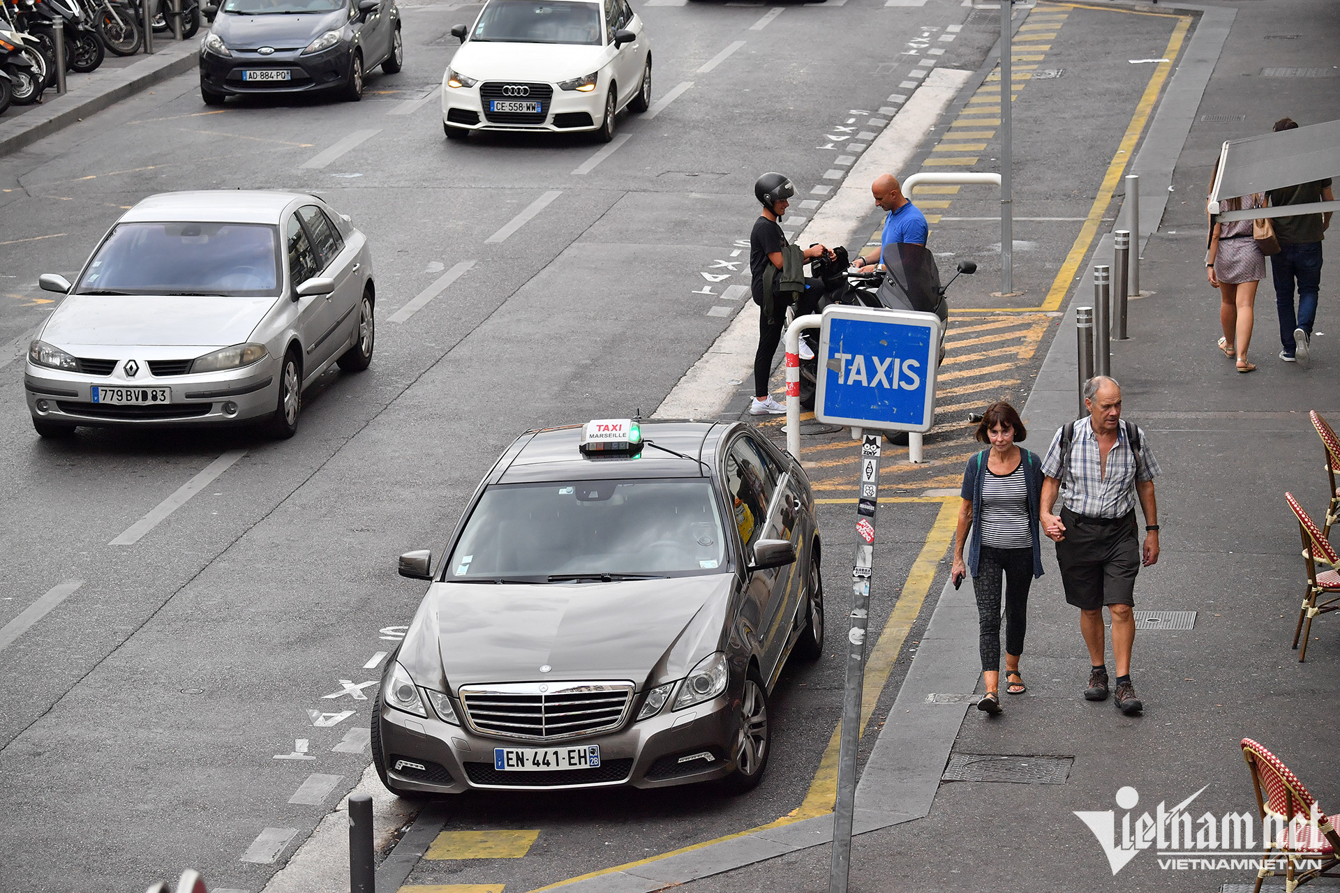 Marseille, Pháp. Khu vực đỗ xe máy, taxi được thiết lập riêng ở lề đường, có hàng rào ngăn cách.