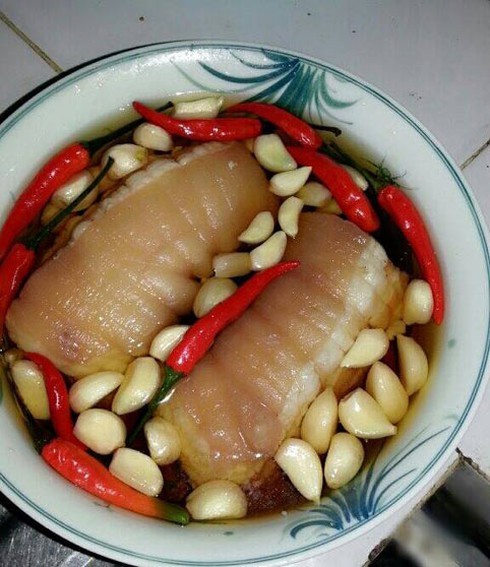 Chuẩn bị: Chân giò lợn, nước mắm, giấm, ớt, đường, tỏi, xả, gừng, lọ thủy tinh.