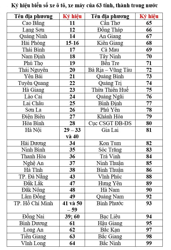 Hai số đầu: Ký hiệu địa phương đăng ký xe. Ký hiệu của từng địa phương như ở bảng nêu trên, bao gồm hai chữ số, từ 11-99.