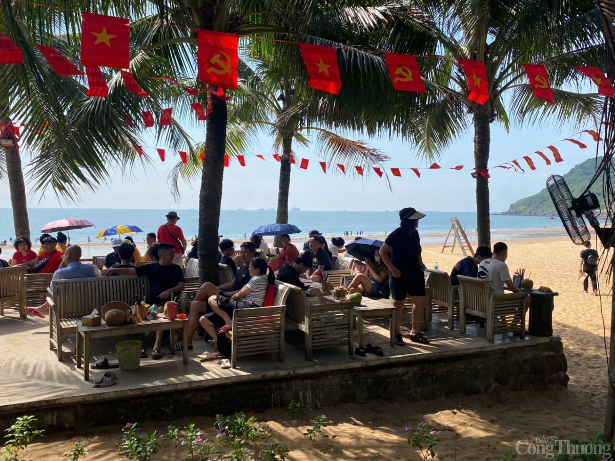 Sau khi nhận vé, đoàn chúng tôi di chuyển xuống khu vực bãi biển. Bãi Đông thực sự rất đẹp, hoang sơ. Tuy nhiên, cũng chính sự “hoang sơ” đó đã làm khó cho du khách. Cả khu bãi biển chỉ có 2–3 quán bán nước và vài chỗ có dãy ghế ngồi nghỉ để uống nước do đơn vị quản lý khu du lịch bố trí, nhưng lúc này đã chật cứng. Trời nắng nóng, trong khi chỗ ngồi nghỉ không còn nên đoàn chúng tôi nhanh chóng tiến sâu vào phía trong, nơi có những chòi lá sàn rộng khoảng 5–6 mét vuông được dựng lên như những chòi canh biển. Nhưng cơ bản các chòi cũng đã có người ngồi, còn duy nhất một chòi nên chúng tôi định bỏ đồ và cho trẻ con leo lên ngồi nghỉ.