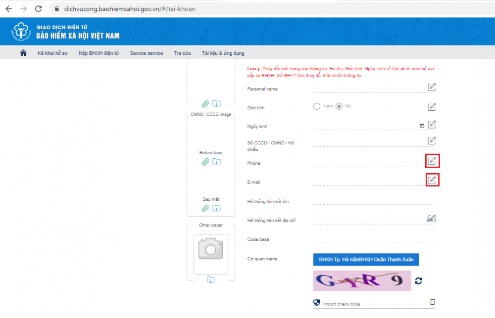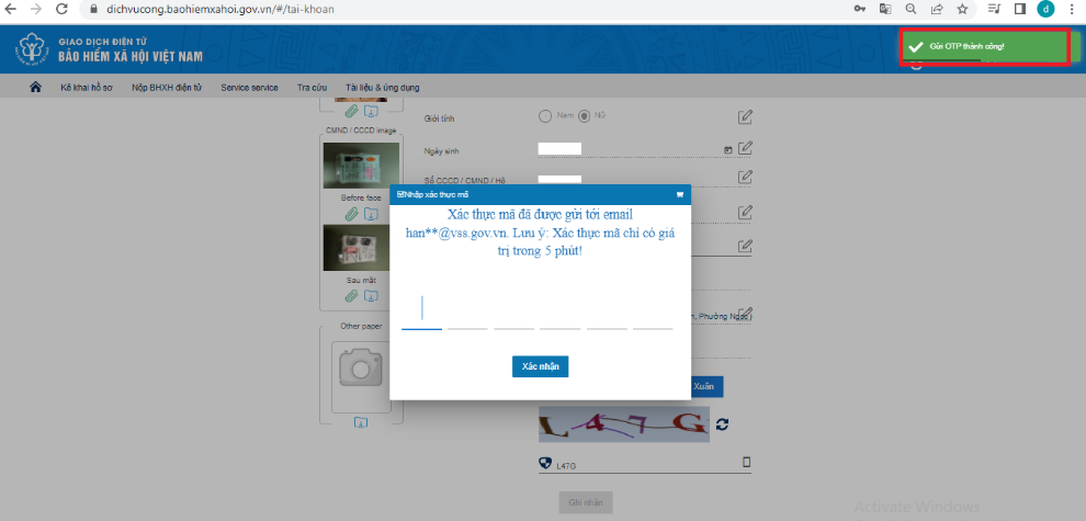 Bước 3: Sau khi điền thông tin số điện thoại, e-mail cần cập nhật, thay đổi tại các mục tương ứng, người dùng tiếp tục nhập mã kiểm tra và chọn “Ghi nhận”, nhập mã xác thực (OTP) được gửi về địa chỉ e-mail đã đăng ký (hoặc e-mail được cập nhật), nhấn “Xác nhận” để hoàn tất quá trình cập nhật, thay đổi thông tin.