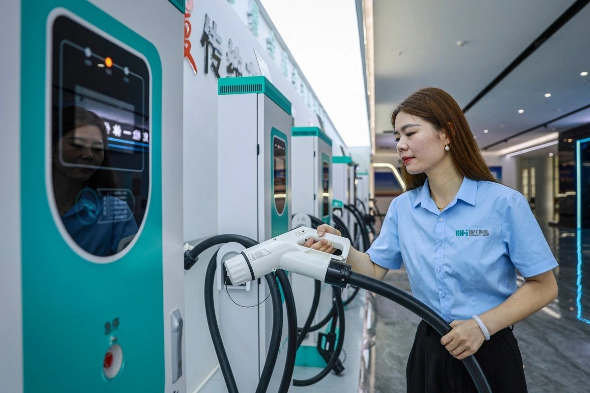 | Nhân viên làm việc tại nhà máy sản xuất trạm sạc xe điện ở tỉnh Giang Tây, Trung Quốc. Ảnh: AP |