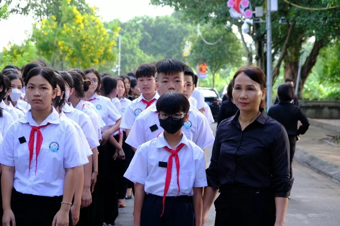 | Chị Nguyễn Thị Vân, người dân làng Đại Đà tổ chức hướng dẫn học sinh chuẩn bị vào viếng Tổng Bí thư Nguyễn Phú Trọng. Ảnh: Thế Duy |