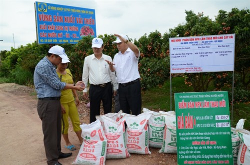 | Cán bộ công ty hướng dẫn cách nhận biết phân bón chính hãng cho bà con |
