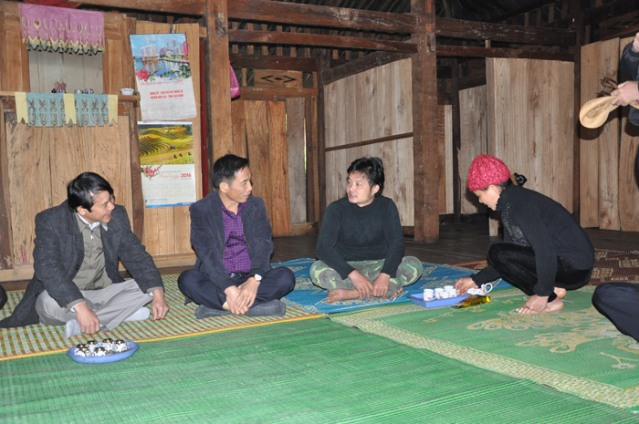 | Thứ trưởng, Phó Chủ nhiệm Ủy ban Dân tộc Ðinh Quế Hải (thứ hai bên trái) tại nhà anh Khiang |