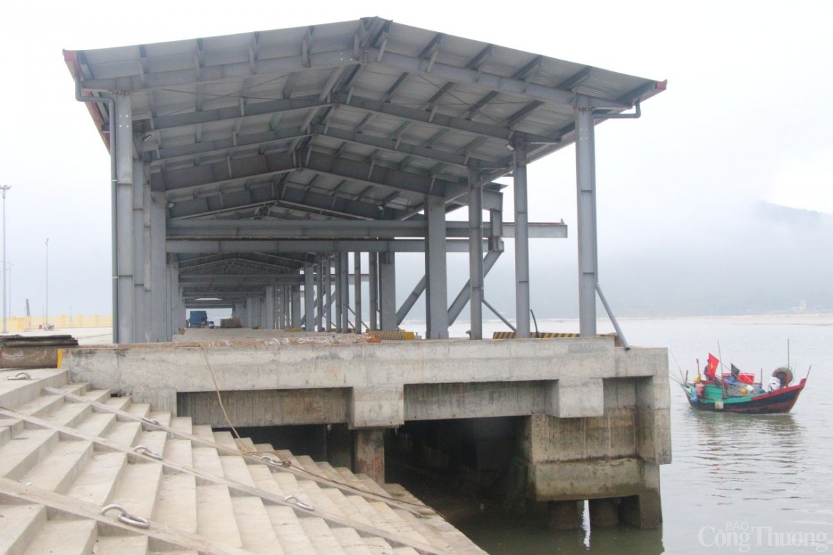 Các hạng mục công trình giao thông của dự án gồm: Bến cập tàu từ 150CV tới 400CV; bến cập tàu dưới 150CV; bãi tiếp nhận thủy sản diện tích 2.400m2; nạo vét luồng vào cảng và khu vực vùng nước trước cảng; hệ thống báo hiệu đường thủy nội địa; kè bờ, đê ngăn cát, đường nội bộ trong cảng (trong ảnh: Hệ thống cầu cảng có mai che kiên cố hiện đại của cảng cá). |