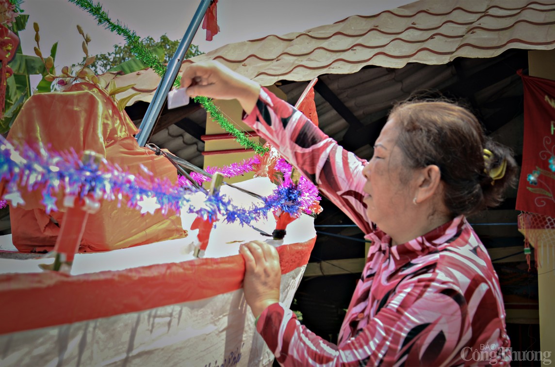 | Những ngư dân sống nghề bà cậu trang trí con thuyền Tống ôn - vật không thể thiếu trong cuộc mưu sinh trong lễ cầu an. |