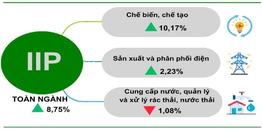 Trong các ngành công nghiệp cấp I, ngành chế biến, chế tạo tiếp tục là động lực chính khi ước tính tăng 12,70% so với cùng kỳ năm trước. Ngành sản xuất và phân phối điện giữ mức tăng nhẹ 2,23%, trong khi ngành cung cấp nước, quản lý và xử lý rác thải, nước thải giảm 1,08%. Riêng trong tháng 4, hoạt động cung cấp nước và xử lý chất thải giảm 4,47% so với cùng kỳ, cho thấy cần có sự điều chỉnh trong quy hoạch và đầu tư vào ngành này.