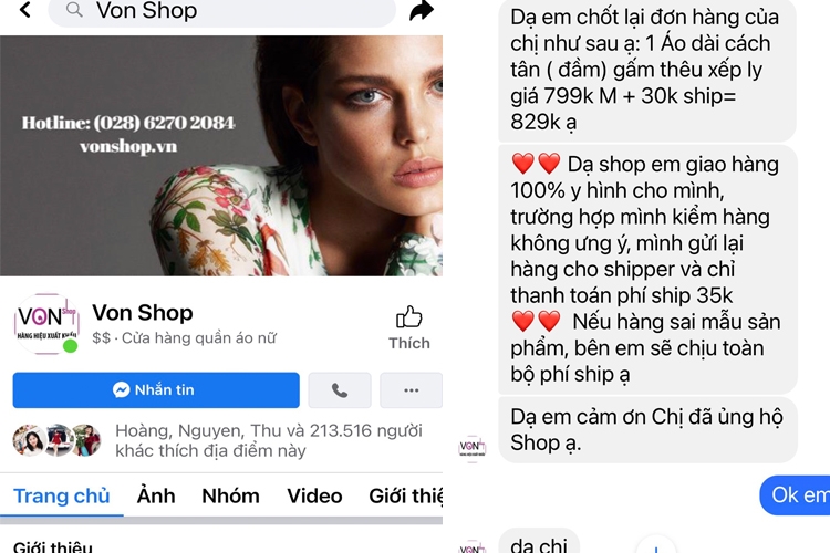 Đến bây giờ, chị Nguyễn Thùy Ngân (quận Hoàn Kiếm, Hà Nội) cho biết vẫn chưa hết "choáng" với một đơn hàng mua online vì cảm giác còn hơn cả một cú lừa. Chị Ngân chia sẻ, có đặt mua một chiếc áo dài cách tân gấm thêu xếp ly size M với giá 799.000 đồng chưa tính phí ship trên mạng xã hội tên là Von shop địa chỉ ở Lê Văn Sỹ, phường 1, quận Tân Bình, TP. HCM.