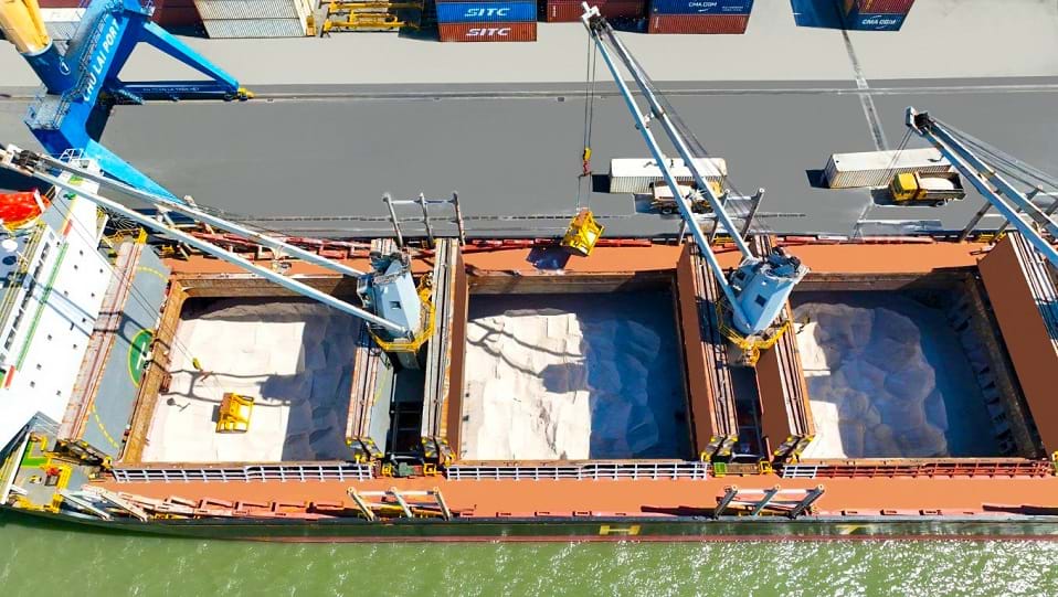 | Nhiều gầu ngoạm hoạt động cùng một lúc giúp quá trình giải phóng hàng từ hầm tàu được nhanh chóng, dễ dàng. |