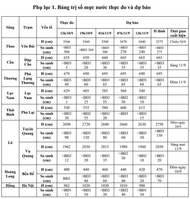Lũ trên sông Lô (Tuyên Quang, Phú Thọ), sông Cầu (Bắc Ninh), sông Thương (Bắc Giang), sông Thái Bình (Hải Dương), sông Hồng (Hà Nội), sông Hoàng Long (Ninh Bình) đang lên; sông Lục Nam (Bắc Giang) đang xuống chậm. Mực nước lúc 13h/10/9, trên các sông như sau: