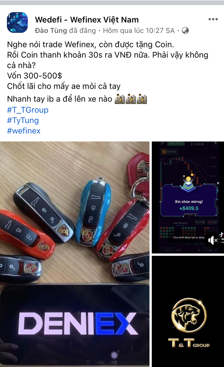 Cụ thể, trên mạng xã hội facebook thời gian gần đây xuất hiện một số tài khoản sử dụng tên thương hiệu T&T Group và logo hình đầu hổ (đã được Tập đoàn T&T Group đăng ký sở hữu trí tuệ) làm tên đại diện nhóm, sử dụng các giá trị cốt lõi của T&T Group làm nội dung quảng bá, lôi kéo, kêu gọi tham gia các sàn giao dịch tiền ảo có tên Deniex, Binamex…