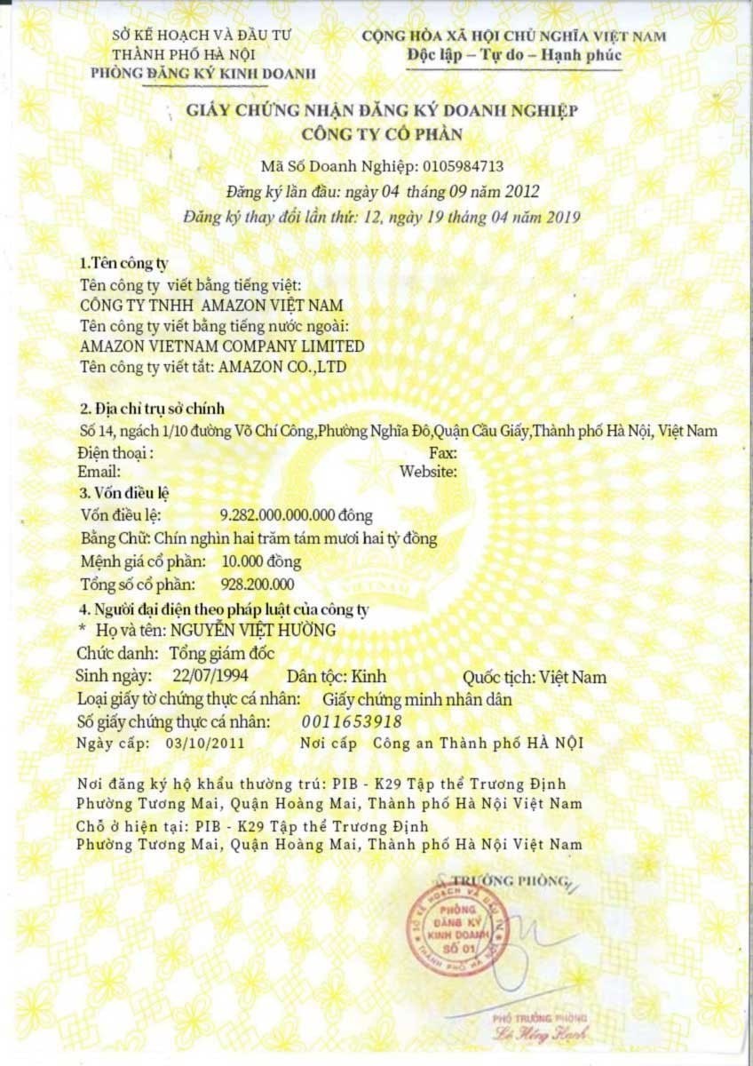 | Doanh nghiệp lấy tên gọi “Công ty TNHH Amazon Việt Nam” với địa chỉ trên Giấy đăng ký kinh doanh tại Số 14, ngách 1/10 đường Võ Chí Công, Phường Nghĩa Đô, Quận Cầu Giấy, Hà Nội để lừa đảo |